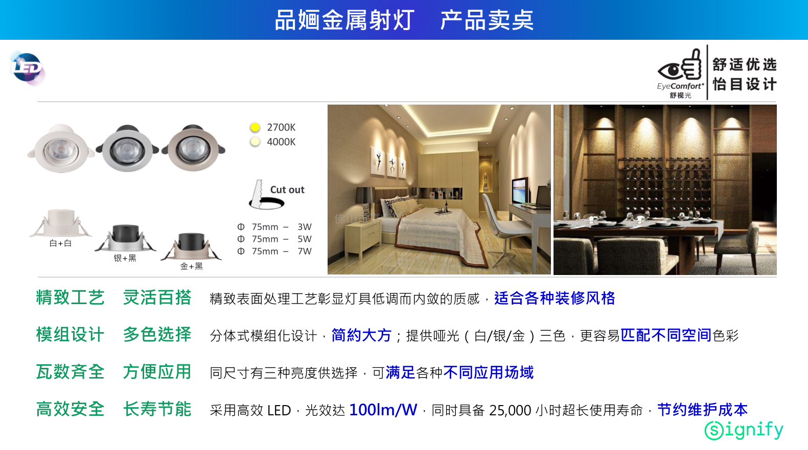 品牌:飞利浦照明 型号:直径75MM开孔 光源类型:LED 光源功率:3W/5W/7W W 电压:220 V 加工定制:否 主要适用范围:家居,商店,酒店,会议室 高效 节能 采用高效 LED,光效达100lm/W ,同时具备 25,000小时长使用寿命, 节约维护成本