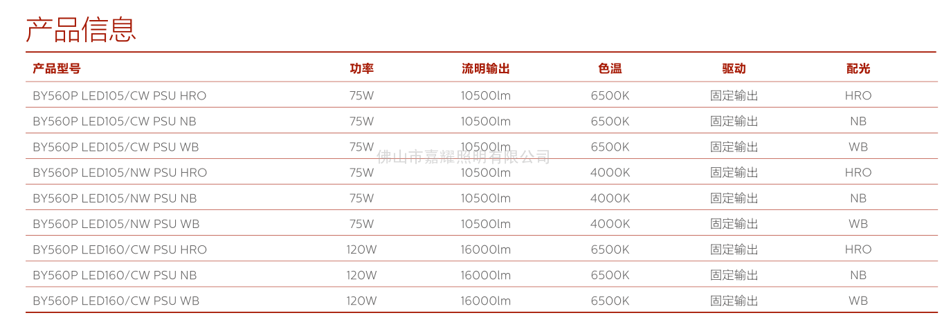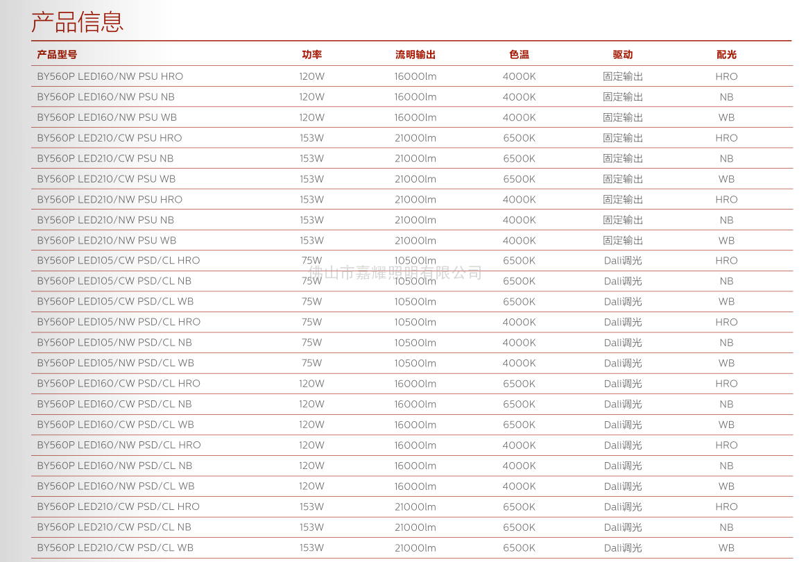 订购信息 产品名称 *高暗淡级别 适用于随机开关 可调光 光学类型 色温 光通量 功率 911401502951 BY560P LED105/NW PSU WB no no WB 4000k 10500lm 75w 911401503051 BY560P LED105/NW PSU HRO no no HRO 4000k 10500lm 75w 911401520351 BY560X LED210/CW ACW2 IS HRO 1% yes HRO 6500k 21000lm 153w 911401520751 BY560X LED210/CW ACW2 IS WB 1% yes WB 6500k 21000lm 153w 911401520951 BY560X LED210/NW ACW2 IS NB 1% yes NB 4000k 21000lm 153w 911401521051 BY560X LED210/NW ACW2 IS HRO 1% yes HRO 4000k 21000lm 153w 911401521151 BY560X LED210/CW ACW2 IS NB 1% yes NB 6500k 21000lm 153w 911401521251 BY560X LED210/NW ACW2 IS WB 1% yes WB 4000k 21000lm 153w 911401521451 BY560X LED160/CW ACW2 IS WB 1% yes WB 6500k 16000lm 120w 911401521551 BY560X LED160/CW ACW2 IS HRO 1% yes HRO 6500k 16000lm 120w 911401521651 BY560X LED160/NW ACW2 IS HRO 1% yes HRO 4000k 16000lm 120w 911401521751 BY560X LED160/CW ACW2 IS NB 1% yes NB 6500k 16000lm 120w 911401521851 BY560X LED160/NW ACW2 IS NB 1% yes NB 4000k 16000lm 120w 911401522451 BY560X LED160/NW ACW2 IS WB 1% yes WB 4000k 16000lm 120w 911401522051 BY560X LED105/CW ACW2 IS HRO 1% yes HRO 6500k 10500lm 75w 911401522251 BY560X LED105/CW ACW2 IS NB 1% yes NB 6500k 10500lm 75w 911401522551 BY560X LED105/CW ACW2 IS WB 1% yes WB 6500k 10500lm 75w 911401522651 BY560X LED105/NW ACW2 IS WB 1% yes WB 4000k 10500lm 75w 911401522751 BY560X LED105/NW ACW2 IS NB 1% yes NB 4000k 10500lm 75w 911401522851 BY560X LED105/NW ACW2 IS HRO 1% yes HRO 4000k 10500lm 75w -
