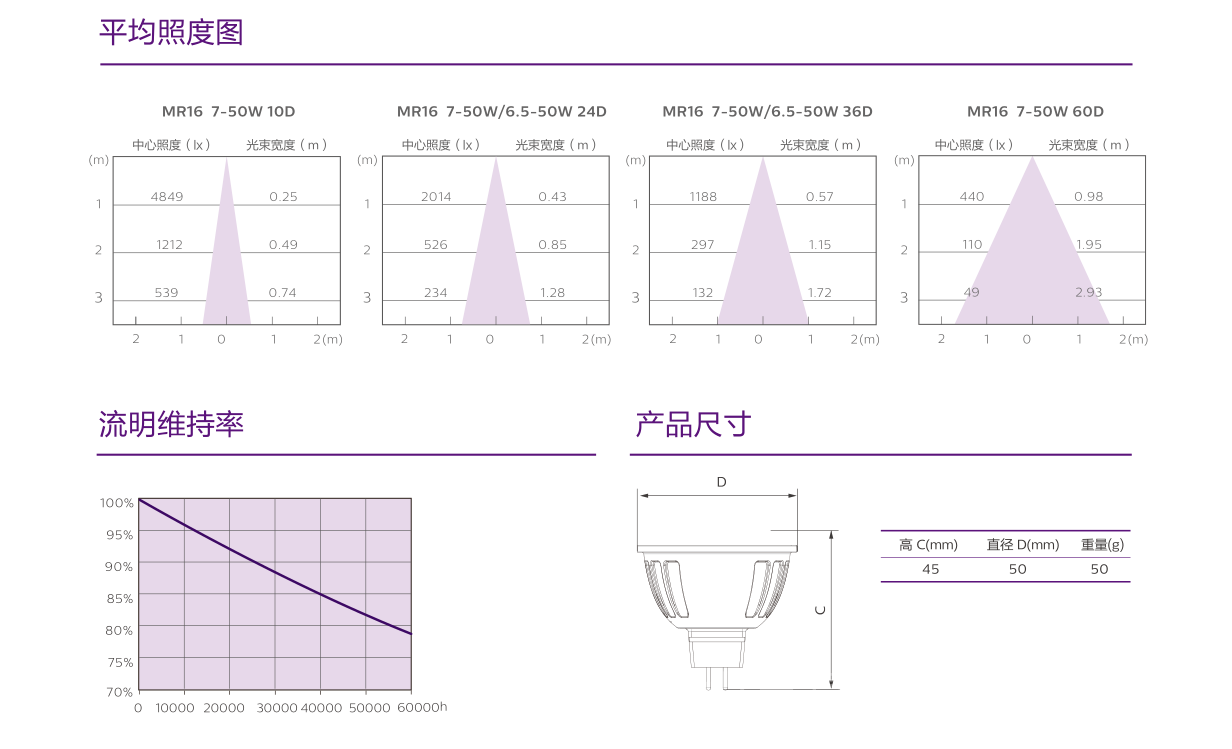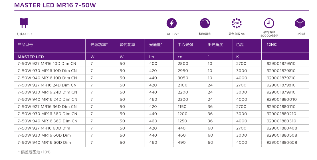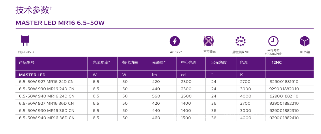 飞利浦MASTER LED MR16 6.5-50W不可调光12V/LED灯杯产品规格