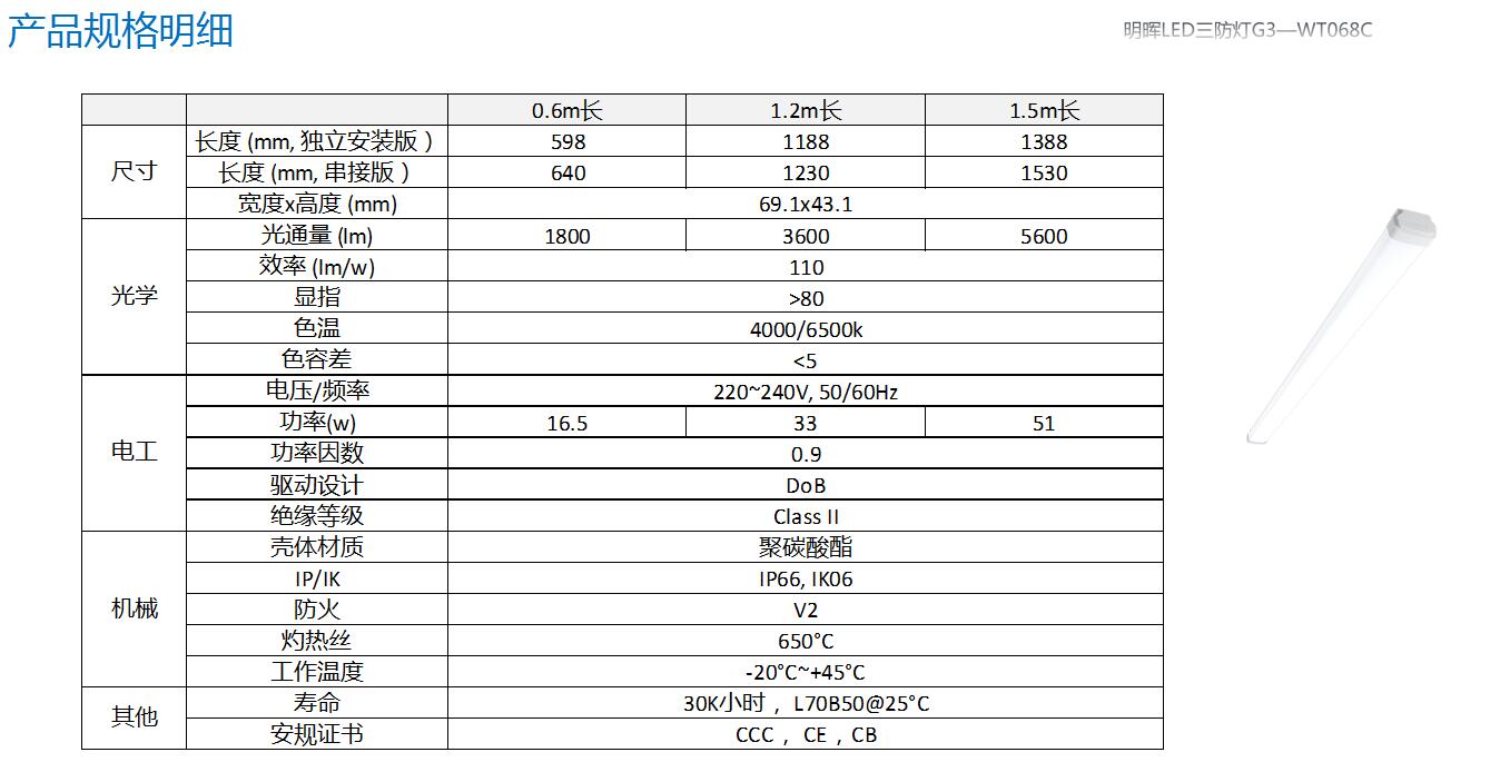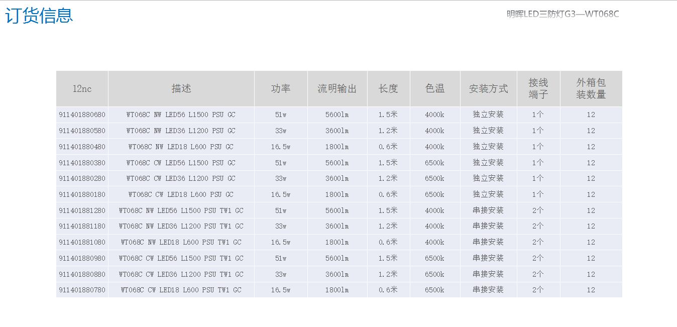 装数量911401880680 WT068C NW LED56 L1500 PSU GC 51w 5600lm 1.5米 4000k 独立安装 1个 12 911401880580 WT068C NW LED36 L1200 PSU GC 33w 3600lm 1.2米 4000k 独立安装 1个 12 911401880480 WT068C NW LED18 L600 PSU GC 16.5w 1800lm 0.6米 4000k 独立安装 1个 12 911401880380 WT068C CW LED56 L1500 PSU GC 51w 5600lm 1.5米 6500k 独立安装 1个 12 911401880280 WT068C CW LED36 L1200 PSU GC 33w 3600lm 1.2米 6500k 独立安装 1个 12 911401880180 WT068C CW LED18 L600 PSU GC 16.5w 1800lm 0.6米 6500k 独立安装 1个 12 911401881280 WT068C NW LED56 L1500 PSU TW1 GC 51w 5600lm 1.5米 4000k 串接安装 2个 12 911401881180 WT068C NW LED36 L1200 PSU TW1 GC 33w 3600lm 1.2米 4000k 串接安装 2个 12 911401881080 WT068C NW LED18 L600 PSU TW1 GC 16.5w 1800lm 0.6米 4000k 串接安装 2个 12 911401880980 WT068C CW LED56 L1500 PSU TW1 GC 51w 5600lm 1.5米 6500k 串接安装 2个 12 911401880880 WT068C CW LED36 L1200 PSU TW1 GC 33w 3600lm 1.2米 6500k 串接安装 2个 12 911401880780 WT068C CW LED18 L600 PSU TW1 GC 16.5w 1800lm 0.6米 6500k 串接安装 2个 12 -