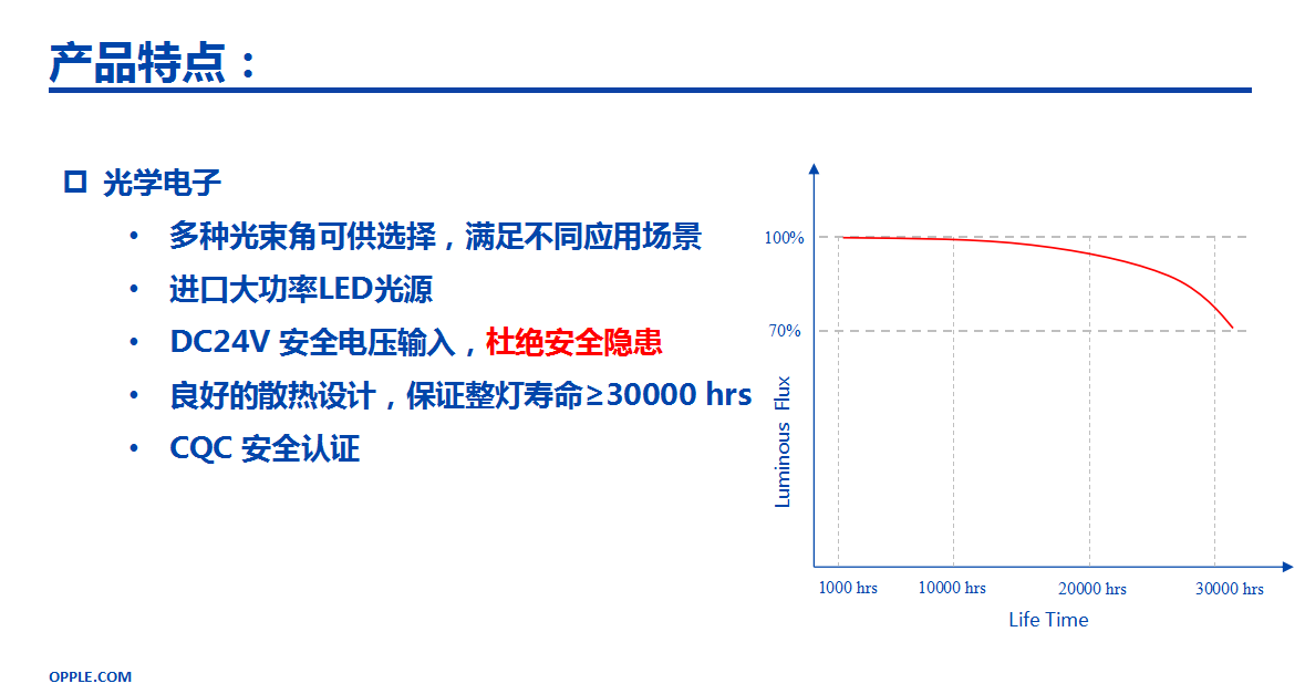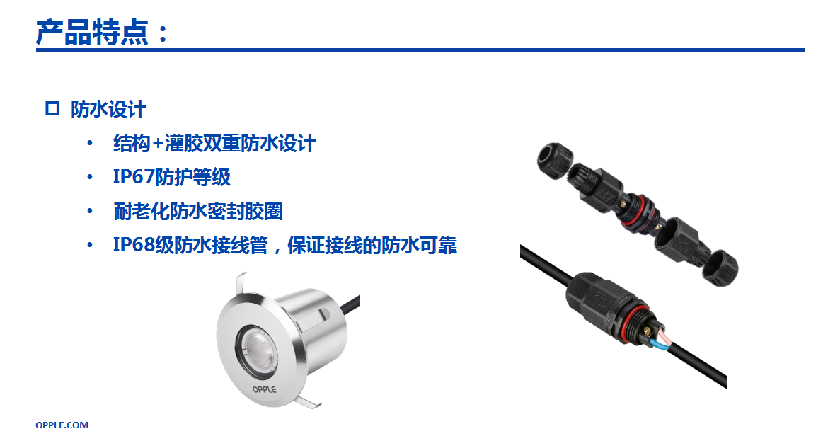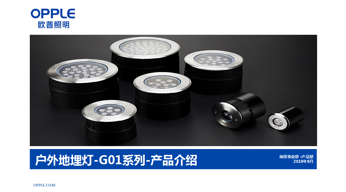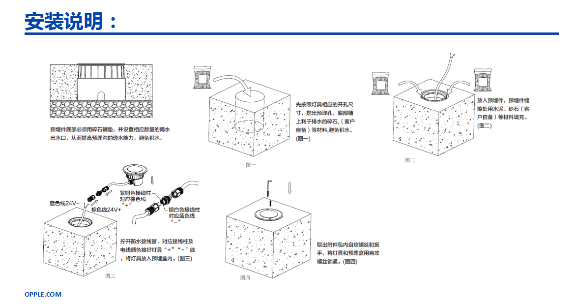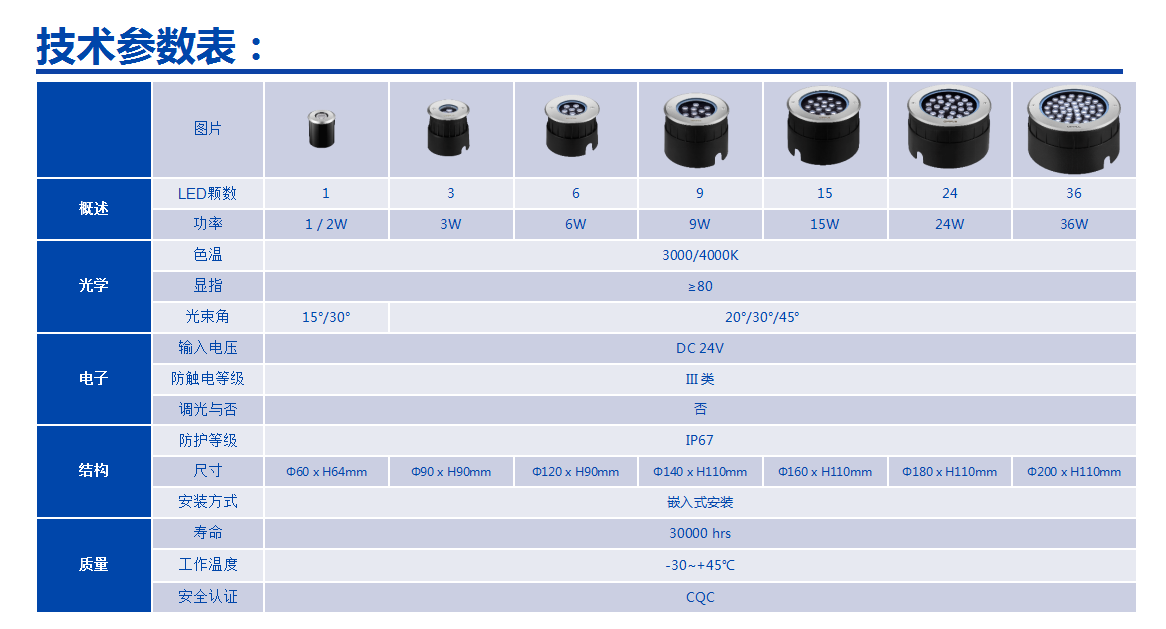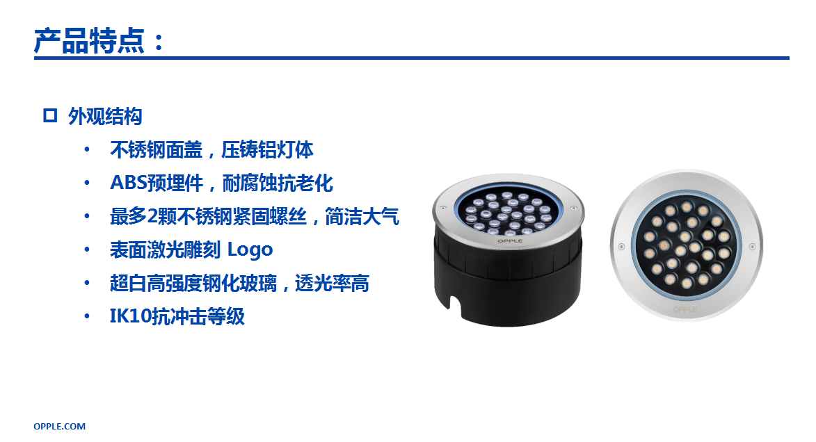 欧普照明G01系列24V户外IP67低压圆形LED地埋灯外观结构:不锈钢面盖,压铸铝灯体 ABS预埋件,耐腐蚀抗老化 *多2颗不锈钢紧固螺丝,简洁大气 表面激光雕刻 Logo 超白高强度钢化玻璃,透光率高 IK10抗冲击等级。结构+灌胶双重防水设计 IP67防护等级 耐老化防水密封胶圈 IP68级防水接线管,保证接线的防水可靠。多种光束角可供选择,满足不同应用场景 进口大功率LED光源 DC24V 安全电压输入,杜绝安全隐患 良好的散热设计,保证整灯寿命≥30000 hrs CQC 安全认证