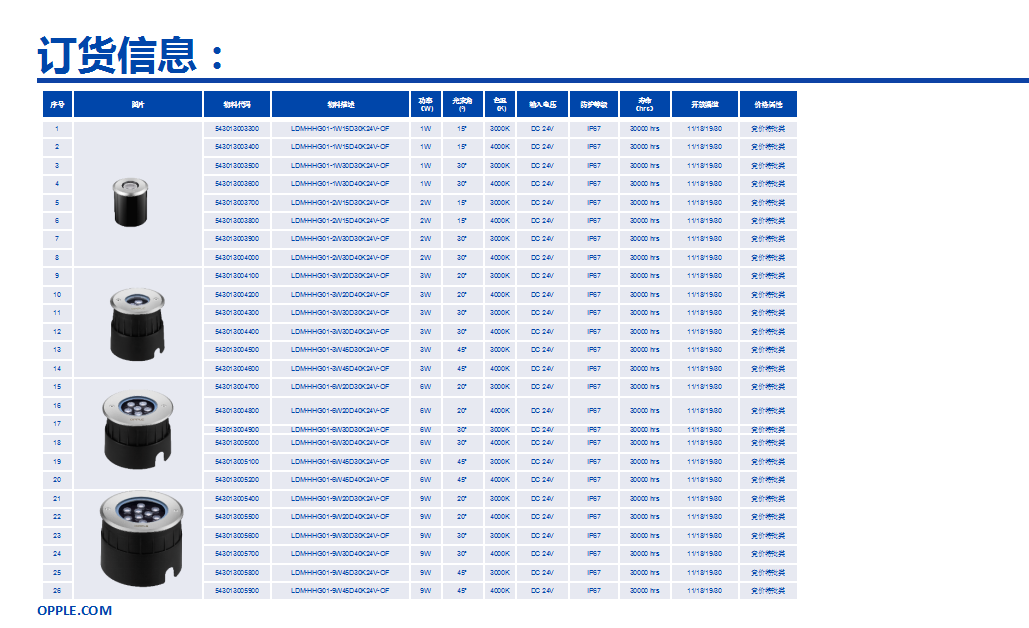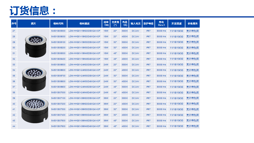 序号 图片 物料代码 物料描述 功率(W) 光束角(°) 色温(K) 输入电压 防护等级 寿命(hrs) 开放渠道 价格属性 1 543013003300 LDM-HHG01-1W15D30K24V-OF 1W 15° 3000K DC 24V IP67 30000 hrs 11/18/19/30 竞价特批类 2 543013003400 LDM-HHG01-1W15D40K24V-OF 1W 15° 4000K DC 24V IP67 30000 hrs 11/18/19/30 竞价特批类 3 543013003500 LDM-HHG01-1W30D30K24V-OF 1W 30° 3000K DC 24V IP67 30000 hrs 11/18/19/30 竞价特批类 4 543013003600 LDM-HHG01-1W30D40K24V-OF 1W 30° 4000K DC 24V IP67 30000 hrs 11/18/19/30 竞价特批类 5 543013003700 LDM-HHG01-2W15D30K24V-OF 2W 15° 3000K DC 24V IP67 30000 hrs 11/18/19/30 竞价特批类 6 543013003800 LDM-HHG01-2W15D40K24V-OF 2W 15° 4000K DC 24V IP67 30000 hrs 11/18/19/30 竞价特批类 7 543013003900 LDM-HHG01-2W30D30K24V-OF 2W 30° 3000K DC 24V IP67 30000 hrs 11/18/19/30 竞价特批类 8 543013004000 LDM-HHG01-2W30D40K24V-OF 2W 30° 4000K DC 24V IP67 30000 hrs 11/18/19/30 竞价特批类 9 543013004100 LDM-HHG01-3W20D30K24V-OF 3W 20° 3000K DC 24V IP67 30000 hrs 11/18/19/30 竞价特批类 10 543013004200 LDM-HHG01-3W20D40K24V-OF 3W 20° 4000K DC 24V IP67 30000 hrs 11/18/19/30 竞价特批类 11 543013004300 LDM-HHG01-3W30D30K24V-OF 3W 30° 3000K DC 24V IP67 30000 hrs 11/18/19/30 竞价特批类 12 543013004400 LDM-HHG01-3W30D40K24V-OF 3W 30° 4000K DC 24V IP67 30000 hrs 11/18/19/30 竞价特批类 13 543013004500 LDM-HHG01-3W45D30K24V-OF 3W 45° 3000K DC 24V IP67 30000 hrs 11/18/19/30 竞价特批类 14 543013004600 LDM-HHG01-3W45D40K24V-OF 3W 45° 4000K DC 24V IP67 30000 hrs 11/18/19/30 竞价特批类 15 543013004700 LDM-HHG01-6W20D30K24V-OF 6W 20° 3000K DC 24V IP67 30000 hrs 11/18/19/30 竞价特批类 16 543013004800 LDM-HHG01-6W20D40K24V-OF 6W 20° 4000K DC 24V IP67 30000 hrs 11/18/19/30 竞价特批类 17 543013004900 LDM-HHG01-6W30D30K24V-OF 6W 30° 3000K DC 24V IP67 30000 hrs 11/18/19/30 竞价特批类 18 543013005000 LDM-HHG01-6W30D40K24V-OF 6W 30° 4000K DC 24V IP67 30000 hrs 11/18/19/30 竞价特批类 19 543013005100 LDM-HHG01-6W45D30K24V-OF 6W 45° 3000K DC 24V IP67 30000 hrs 11/18/19/30 竞价特批类 20 543013005200 LDM-HHG01-6W45D40K24V-OF 6W 45° 4000K DC 24V IP67 30000 hrs 11/18/19/30 竞价特批类 21 543013005400 LDM-HHG01-9W20D30K24V-OF 9W 20° 3000K DC 24V IP67 30000 hrs 11/18/19/30 竞价特批类 22 543013005500 LDM-HHG01-9W20D40K24V-OF 9W 20° 4000K DC 24V IP67 30000 hrs 11/18/19/30 竞价特批类 23 543013005600 LDM-HHG01-9W30D30K24V-OF 9W 30° 3000K DC 24V IP67 30000 hrs 11/18/19/30 竞价特批类 24 543013005700 LDM-HHG01-9W30D40K24V-OF 9W 30° 4000K DC 24V IP67 30000 hrs 11/18/19/30 竞价特批类 25 543013005800 LDM-HHG01-9W45D30K24V-OF 9W 45° 3000K DC 24V IP67 30000 hrs 11/18/19/30 竞价特批类 26 543013005900 LDM-HHG01-9W45D40K24V-OF 9W 45° 4000K DC 24V IP67 30000 hrs 11/18/19/30 竞价特批类 序号 图片 物料代码 物料描述 功率(W) 光束角(°) 色温(K) 输入电压 防护等级 寿命(hrs) 开放渠道 价格属性 27 543013005300 LDM-HHG01-15W20D30K24V-OF 15W 20° 3000K DC 24V IP67 30000 hrs 11/18/19/30 竞价特批类 28 543013006000 LDM-HHG01-15W20D40K24V-OF 15W 20° 4000K DC 24V IP67 30000 hrs 11/18/19/30 竞价特批类 29 543013006100 LDM-HHG01-15W30D30K24V-OF 15W 30° 3000K DC 24V IP67 30000 hrs 11/18/19/30 竞价特批类 30 543013006200 LDM-HHG01-15W30D40K24V-OF 15W 30° 4000K DC 24V IP67 30000 hrs 11/18/19/30 竞价特批类 31 543013006300 LDM-HHG01-15W45D30K24V-OF 15W 45° 3000K DC 24V IP67 30000 hrs 11/18/19/30 竞价特批类 32 543013006400 LDM-HHG01-15W45D40K24V-OF 15W 45° 4000K DC 24V IP67 30000 hrs 11/18/19/30 竞价特批类 33 543013006500 LDM-HHG01-24W20D30K24V-OF 24W 20° 3000K DC 24V IP67 30000 hrs 11/18/19/30 竞价特批类 34 543013006600 LDM-HHG01-24W20D40K24V-OF 24W 20° 4000K DC 24V IP67 30000 hrs 11/18/19/30 竞价特批类 35 543013006700 LDM-HHG01-24W30D30K24V-OF 24W 30° 3000K DC 24V IP67 30000 hrs 11/18/19/30 竞价特批类 36 543013006800 LDM-HHG01-24W30D40K24V-OF 24W 30° 4000K DC 24V IP67 30000 hrs 11/18/19/30 竞价特批类 37 543013006900 LDM-HHG01-24W45D30K24V-OF 24W 45° 3000K DC 24V IP67 30000 hrs 11/18/19/30 竞价特批类 38 543013007000 LDM-HHG01-24W45D40K24V-OF 24W 45° 4000K DC 24V IP67 30000 hrs 11/18/19/30 竞价特批类 39 543013007100 LDM-HHG01-36W20D30K24V-OF 36W 20° 3000K DC 24V IP67 30000 hrs 11/18/19/30 竞价特批类 40 543013007200 LDM-HHG01-36W20D40K24V-OF 36W 20° 4000K DC 24V IP67 30000 hrs 11/18/19/30 竞价特批类 41 543013007300 LDM-HHG01-36W30D30K24V-OF 36W 30° 3000K DC 24V IP67 30000 hrs 11/18/19/30 竞价特批类 42 543013007400 LDM-HHG01-36W30D40K24V-OF 36W 30° 4000K DC 24V IP67 30000 hrs 11/18/19/30 竞价特批类 43 543013007500 LDM-HHG01-36W45D30K24V-OF 36W 45° 3000K DC 24V IP67 30000 hrs 11/18/19/30 竞价特批类 44 543013007600 LDM-HHG01-36W45D40K24V-OF 36W 45° 4000K DC 24V IP67 30000 hrs 11/18/19/30 竞价特批类 -
