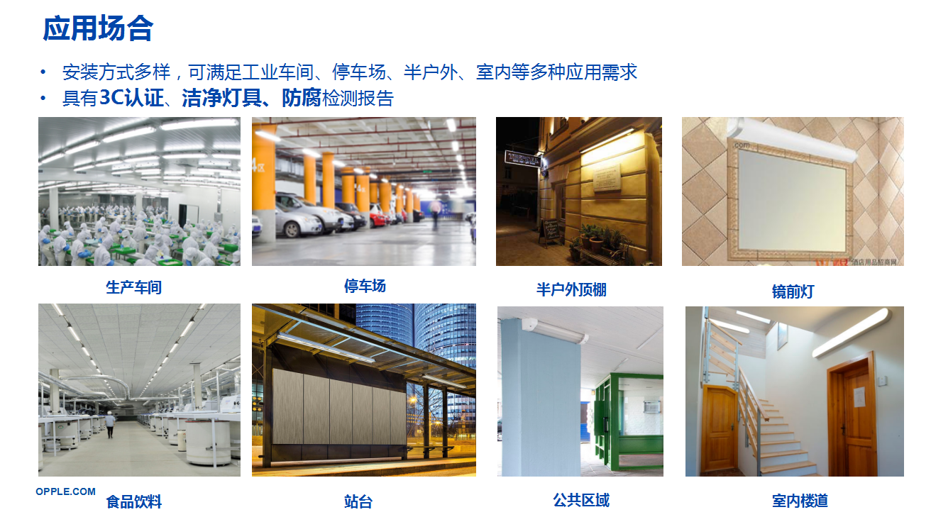 安装方式多样,可满足工业车间、停车场、半户外、室内等多种应用需求 具有3C认证、洁净灯具、防腐检测报告