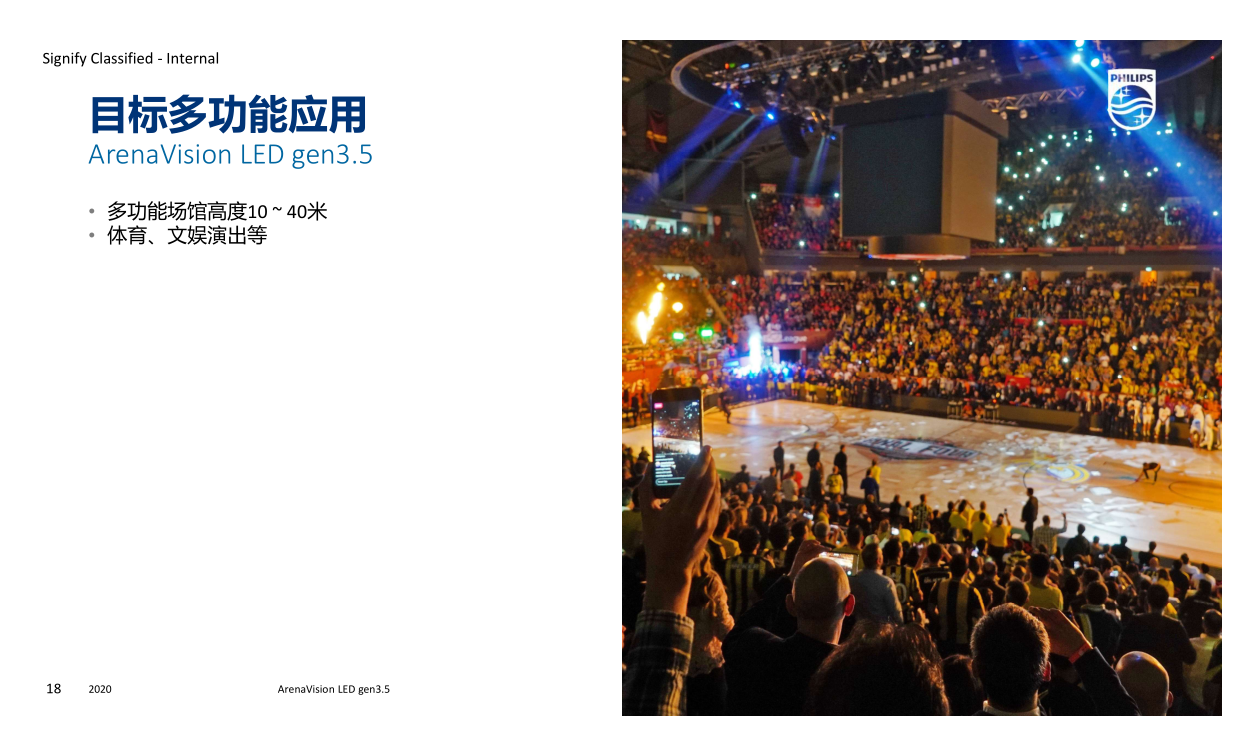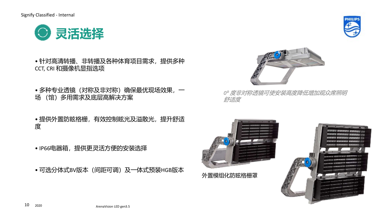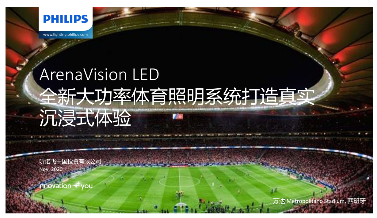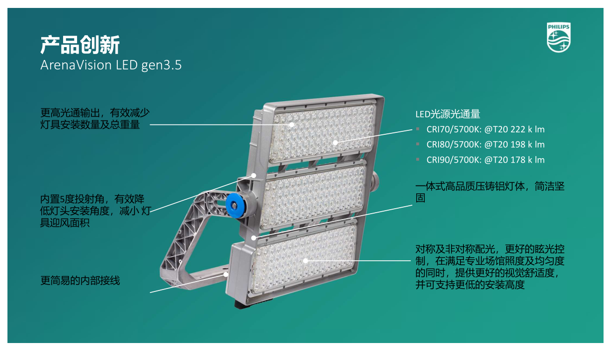 飞利浦ArenaVision LED体育照明系统,支持新的体育高清直播标准,配备体育及多功能场馆应用灯具,提供出色的照明质量,搞效的散热管理和长寿命.满足室内、室外应用,ArenaVision LED 分别提供2款一体化高压铸铝灯体和对应的LED模组,并提供灵活的一体式、分体式独立电器箱安装方式,确保简易的安装和低初始投资.
