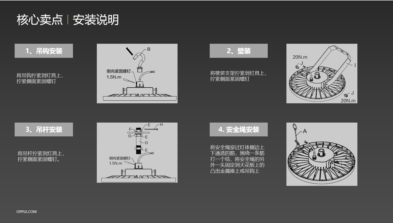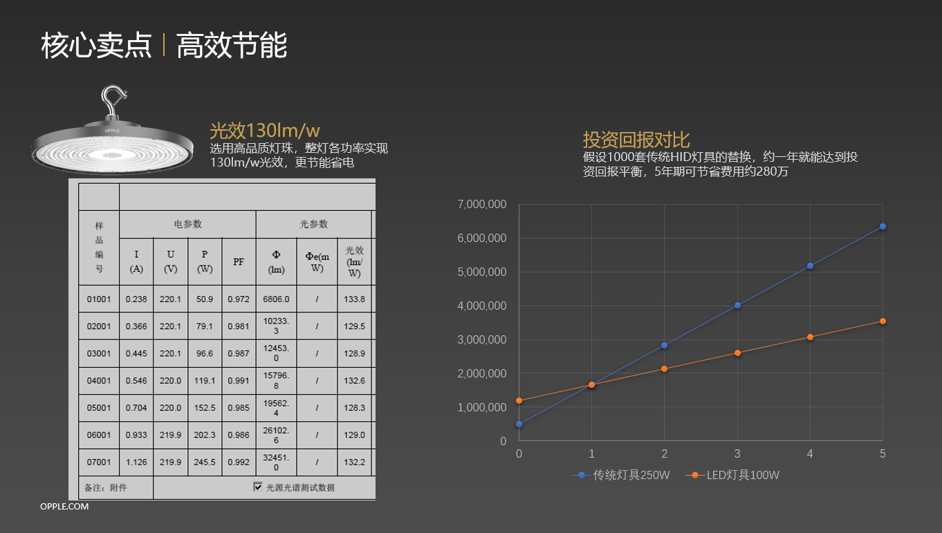 品牌:OPPLE 加工定制:否 型号:LTP09200016 光源类型:LED贴片 光源功率:200 W 电压:220 V 灯罩型式:防眩光铝罩 主要适用范围:厂房,仓库 鹏辰系列是一款高效可靠的LED高天棚灯,它具有50000H寿命,防水等级达到IP65,防冲击水平达到IK08。同时整灯标配1.2m安全绳,使用更放心。鹏辰整灯光效达到130lm/w,整灯